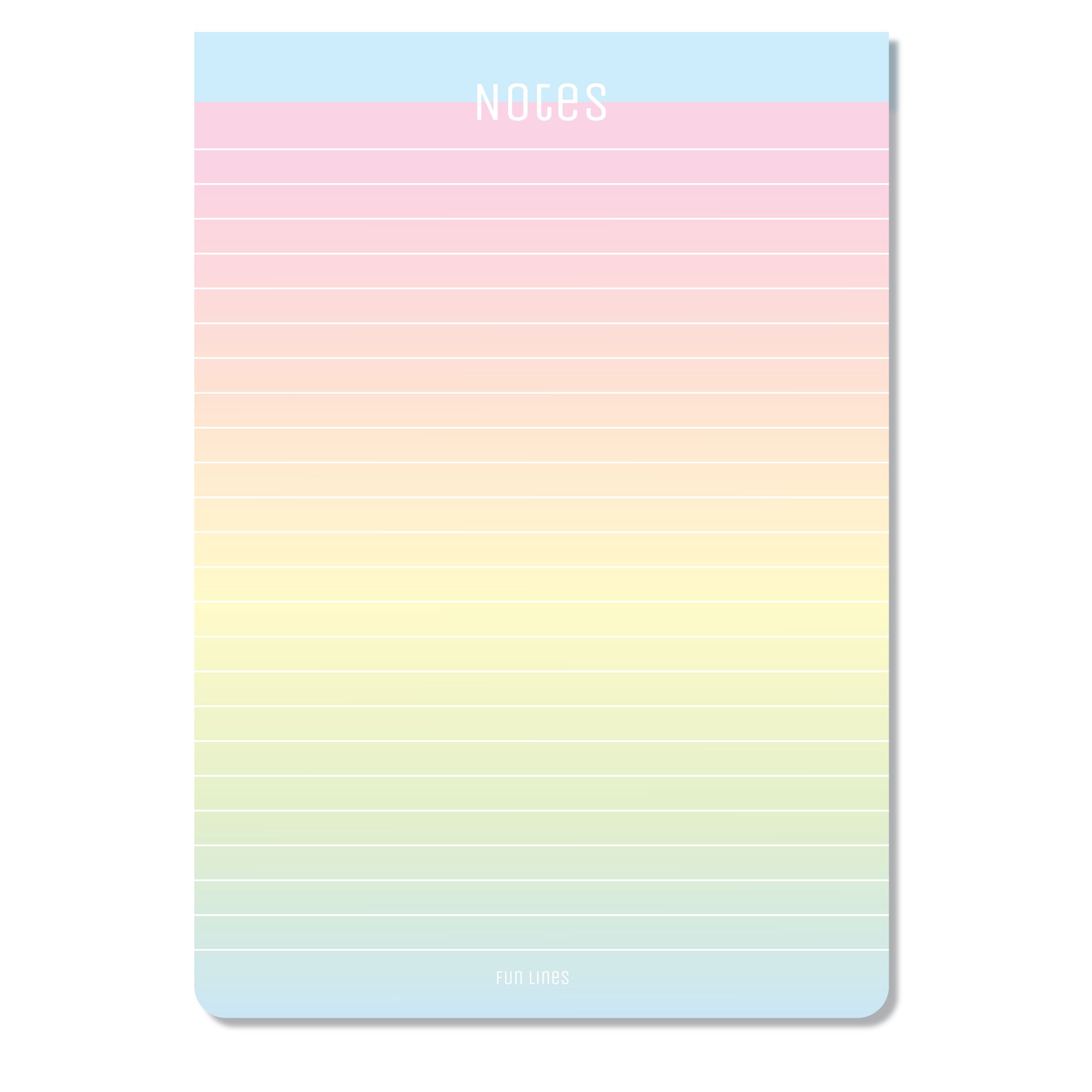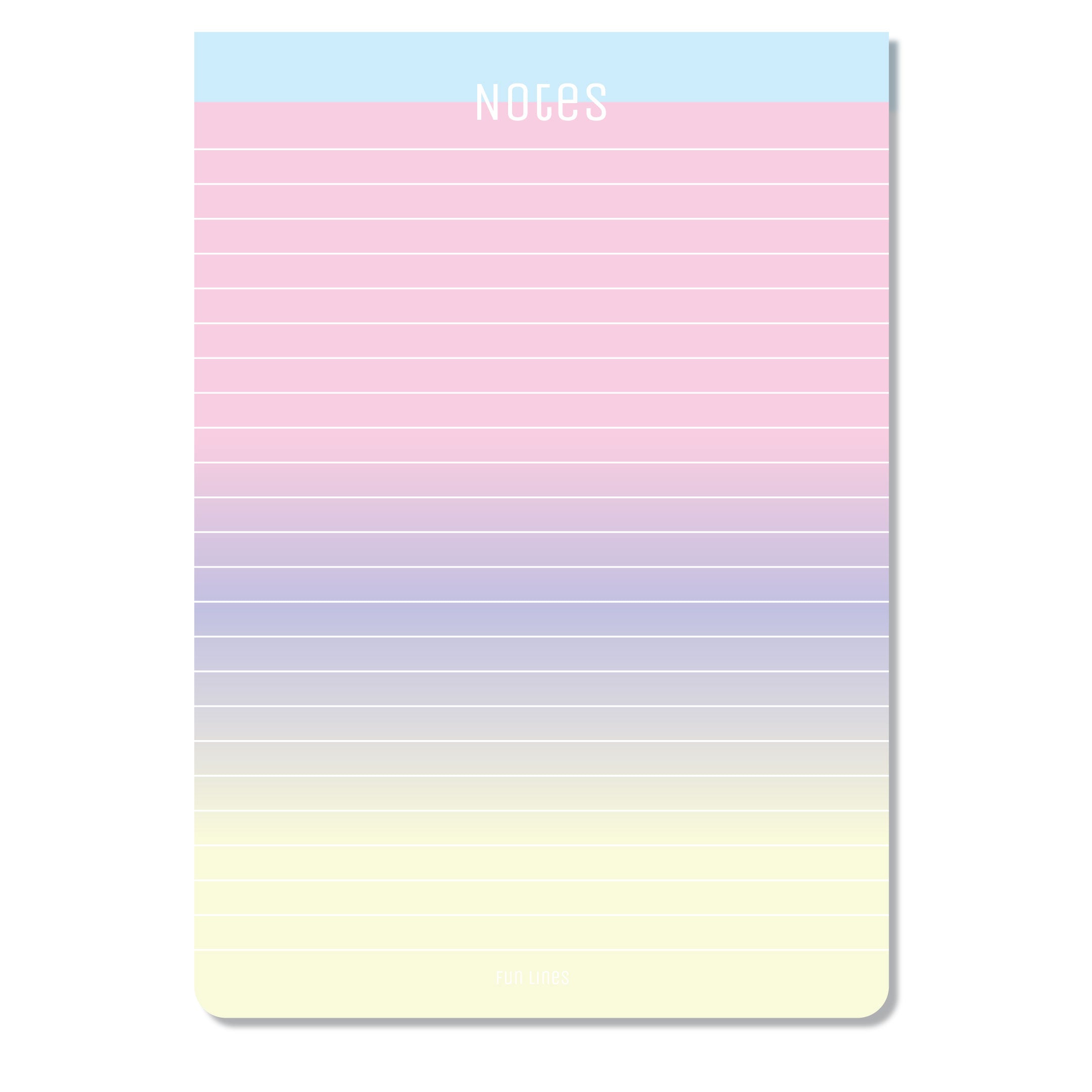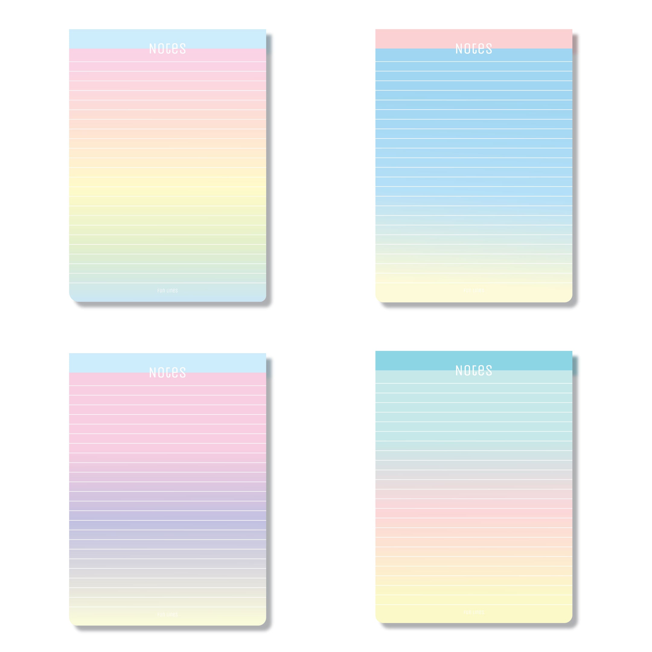 Our tearable pastel gradient ruled notepads are made from high bulk 80 GSM paper which makes writing on them a pleasure. Made using our classic minimal style and playful colour use, they are both beautiful and practical. > Pack of 4? > Hard Cardboard Base > Glue Bound – Easily tearable > Round Corners